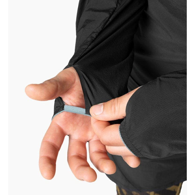 Úplná sloboda pohybu je zaručená vďaka ergonomickému strihu a strečovej tkanine. Dodatočný objem v zadnej časti umožňuje pohodlné nosenie bundy cez bežeckú vestu. Aby sa predišlo prehriatiu počas behu, bunda je perforovaná v podpazuší pre zvýšenie priedušnosti. Obzvlášť šikovné: bunda sa dá úplne otvoriť aj pri ťažkej záťaži a praktický patentný gombík vo výške hrudníka ju drží pohromade. Priliehavú kapucňu je možné v prípade potreby zrolovať a zapnúť, aby pri behu neprekážala.